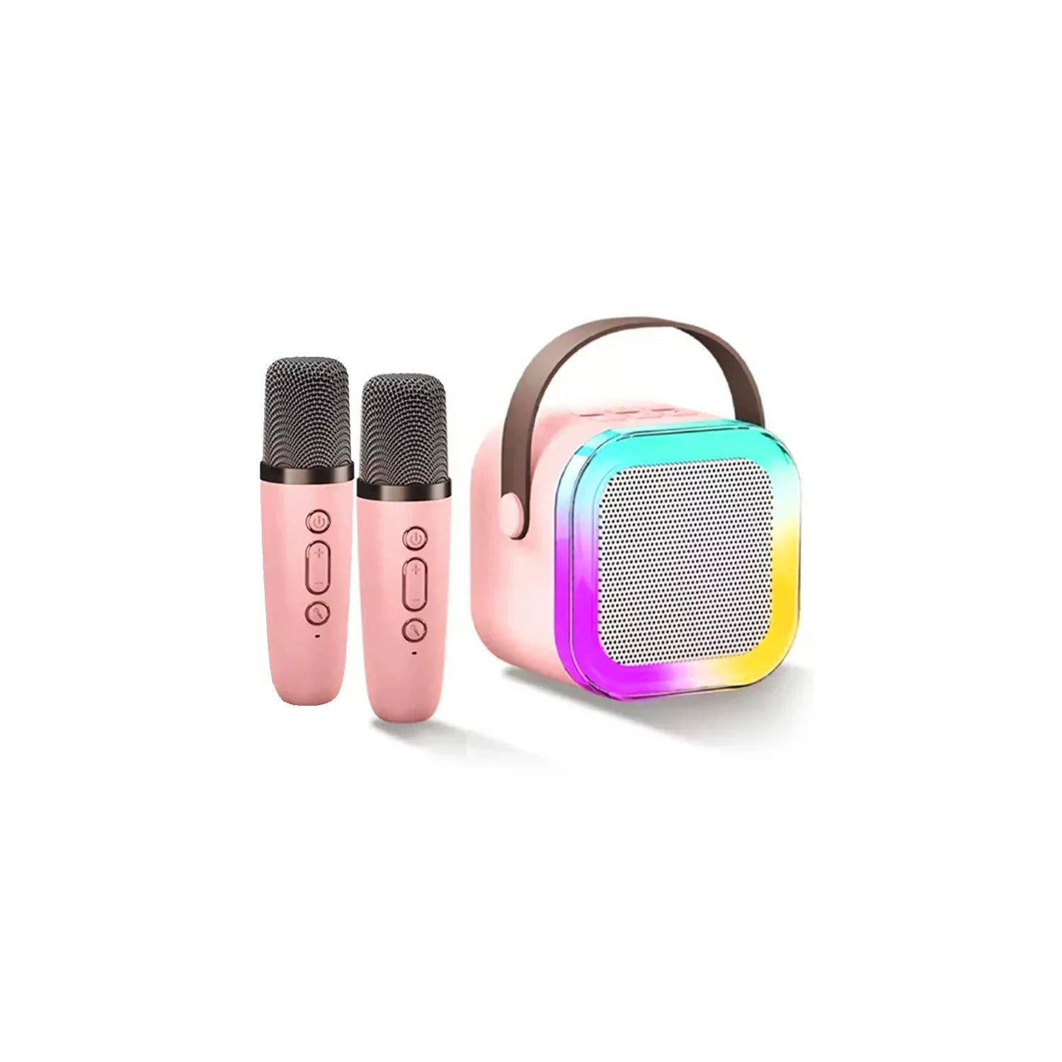 Tiene incluido 2 micrófonos inalámbricos y un parlante con luces LED brillantes: cinco colores dinámicos que iluminan el ambiente.